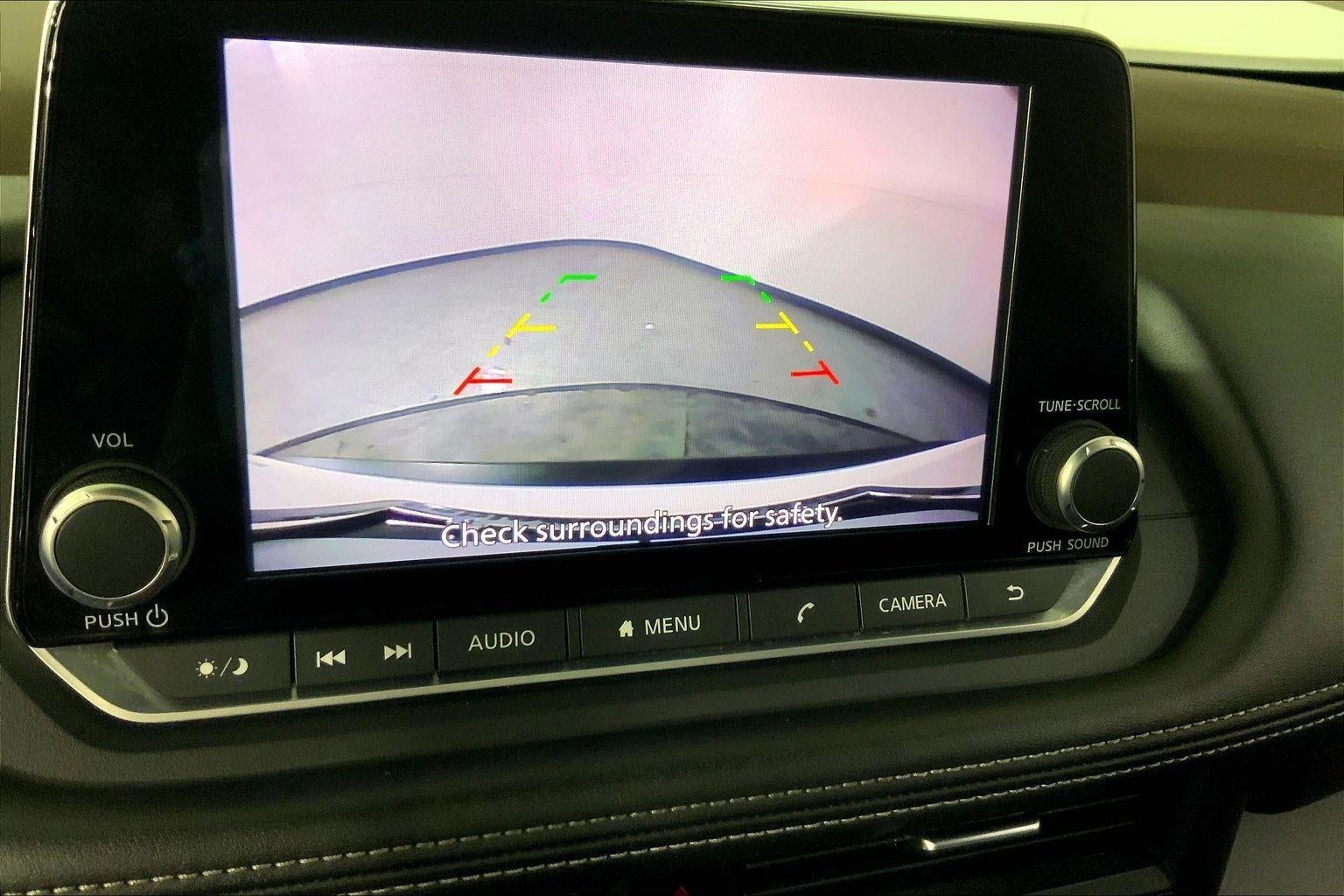 - The vehicle is equipped with a camera that displays an image of the area behind the vehicle on an interior display.