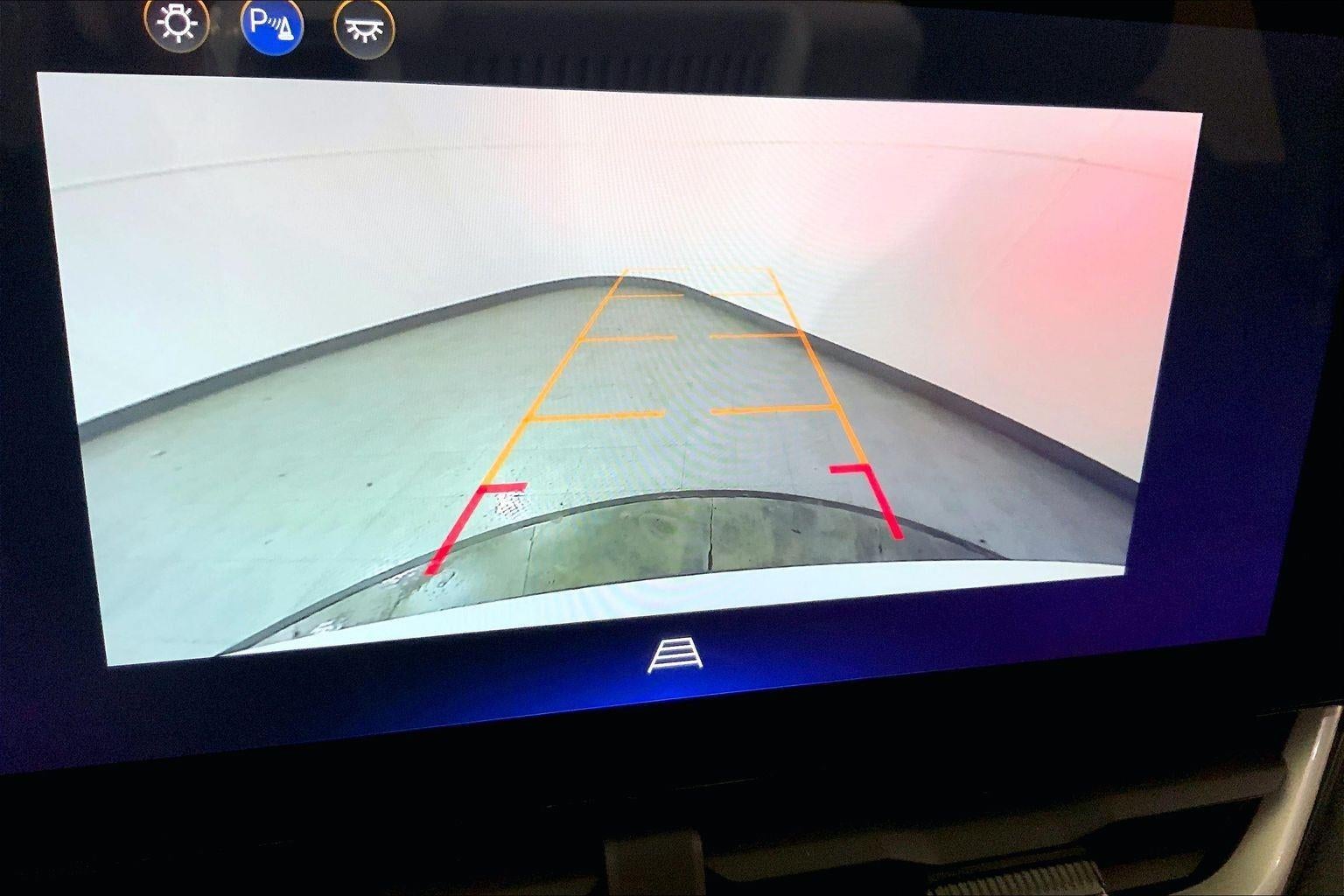 - The vehicle is equipped with a camera that displays an image of the area behind the vehicle on an interior display.